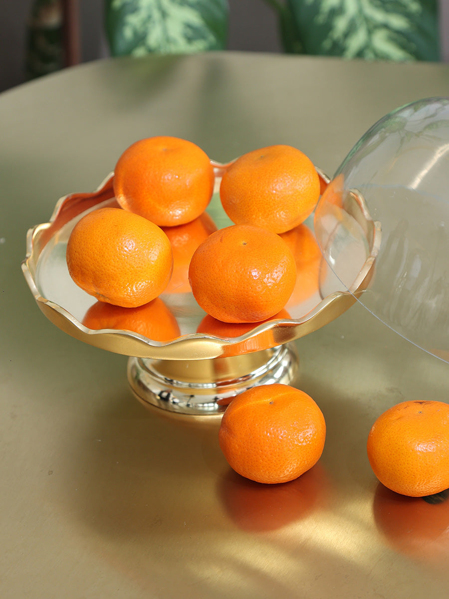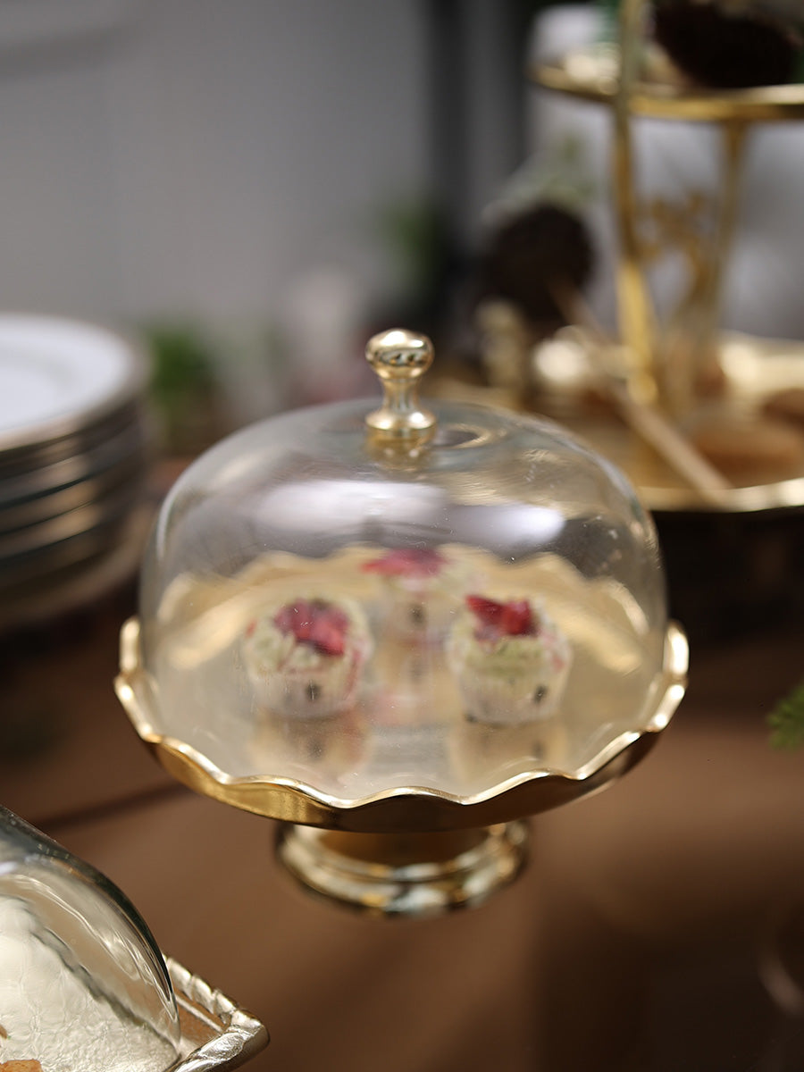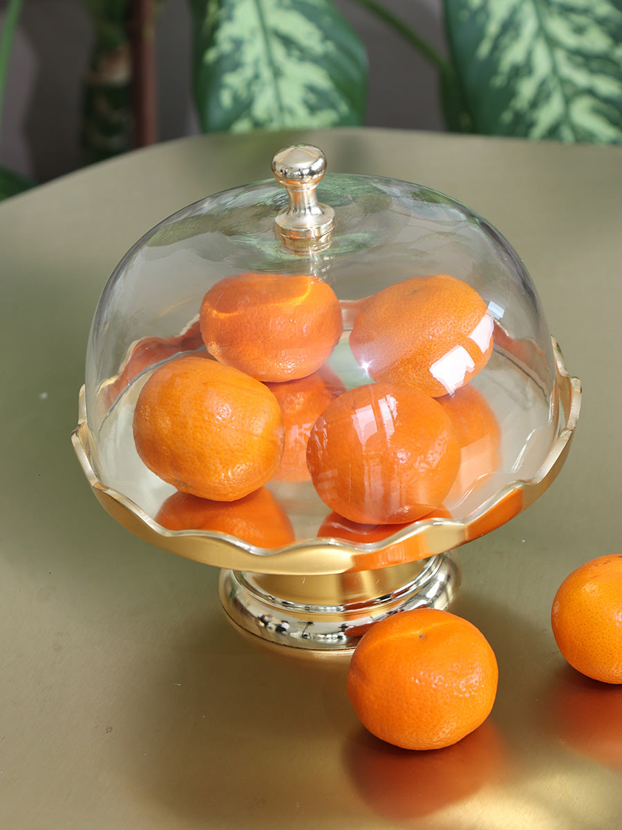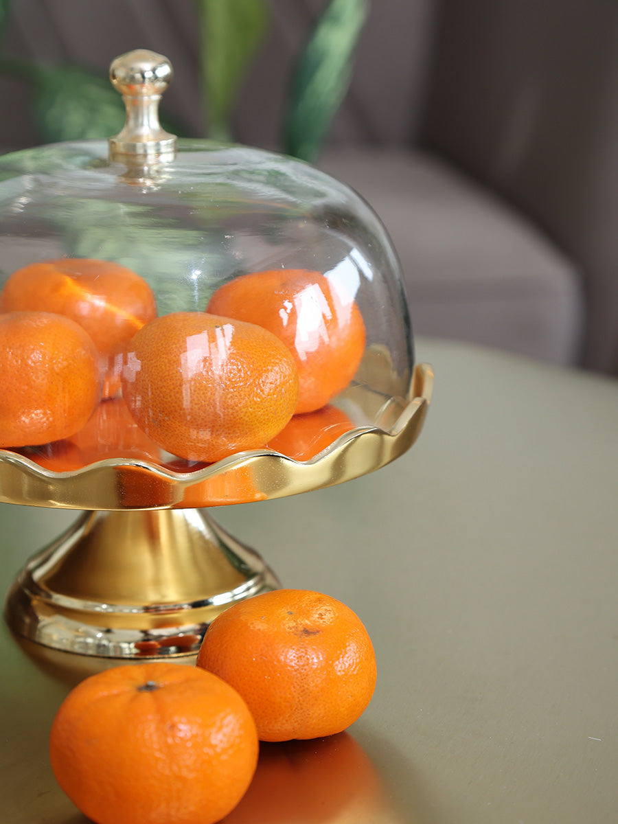 Vintage-Inspired Design: The scalloped gold base and glass cloche exude timeless vintage charm, adding a luxurious touch to your serveware collection.