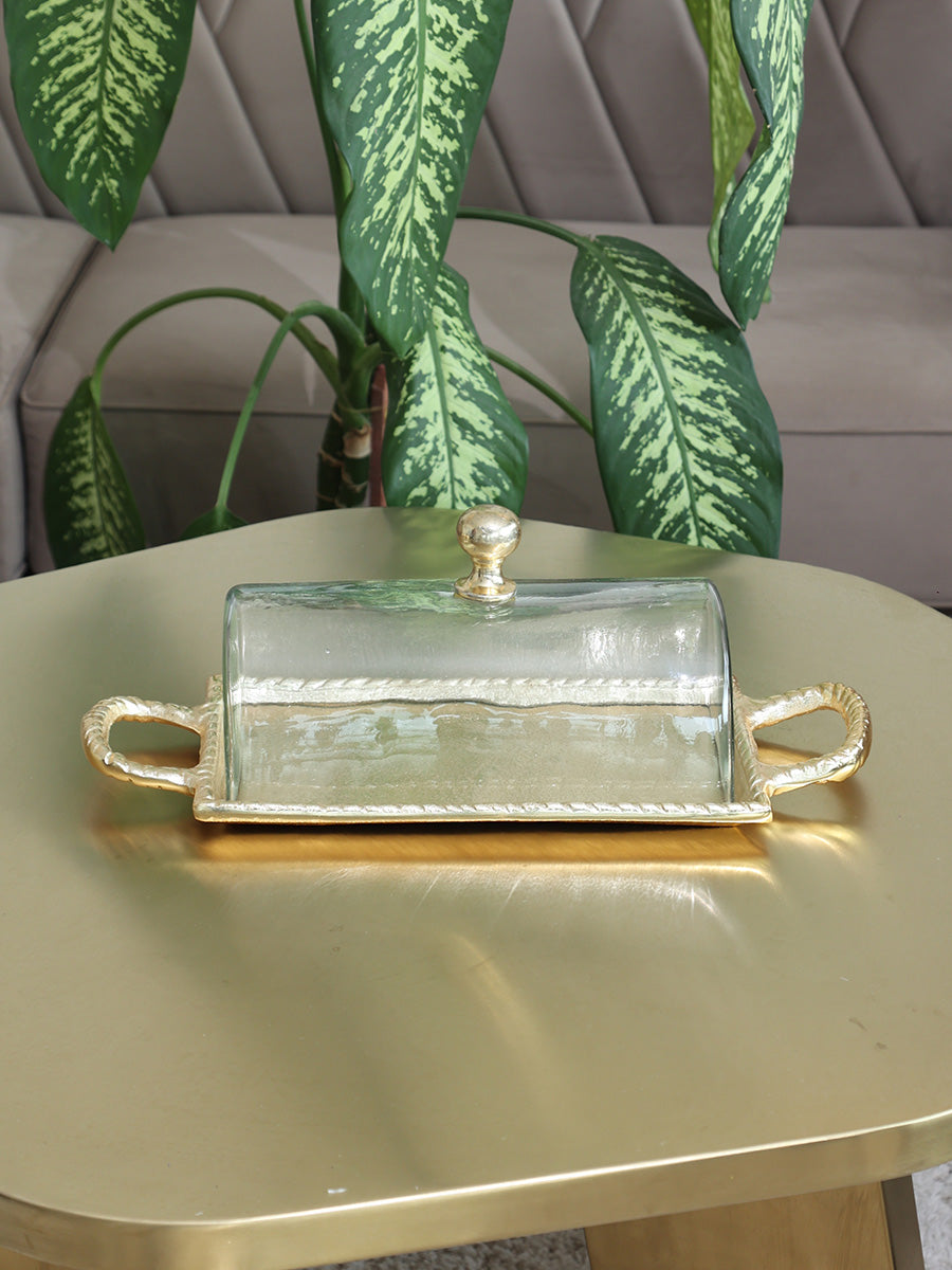 Vintage Design: A classic rectangular gold platter paired with a glass cloche, combining vintage elegance with modern functionality.