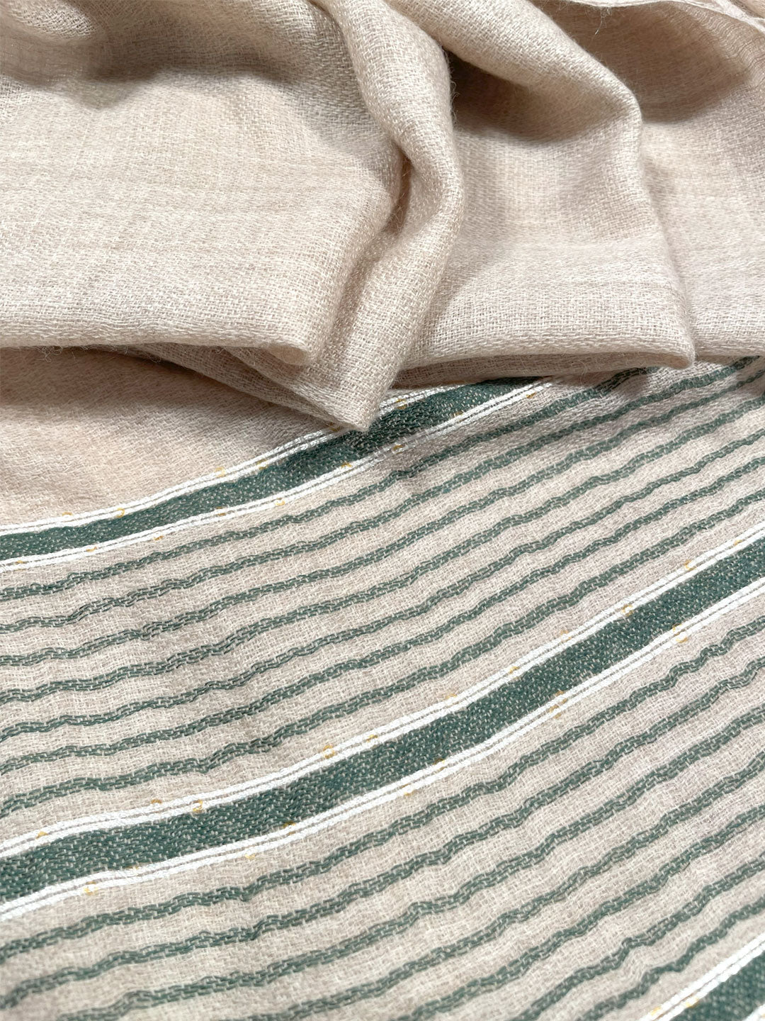 Meticulously crafted from the finest cashmere, this exquisite stole boasts a captivating base, accented by delicate stripes.