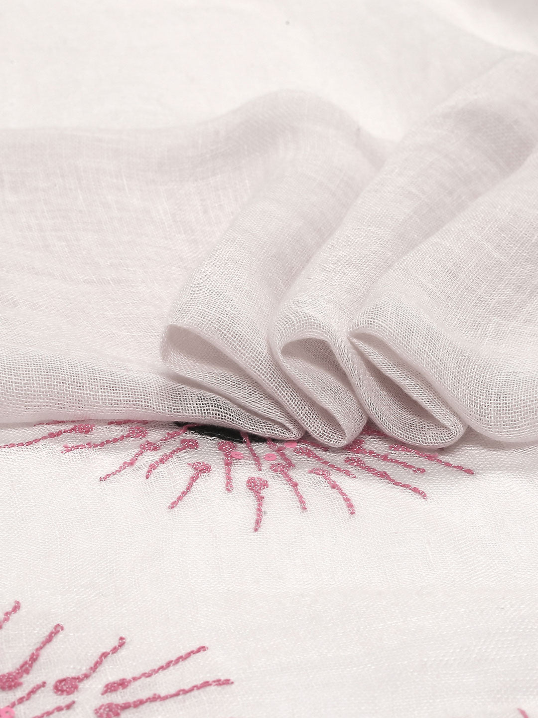 Petalia brings breezy charm in a fresh cotton-linen touch. Cheerful motifs scatter across its snowy-white expanse. Effortless beauty for sunlit days and soft evenings.