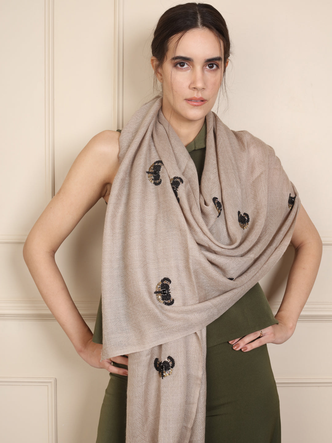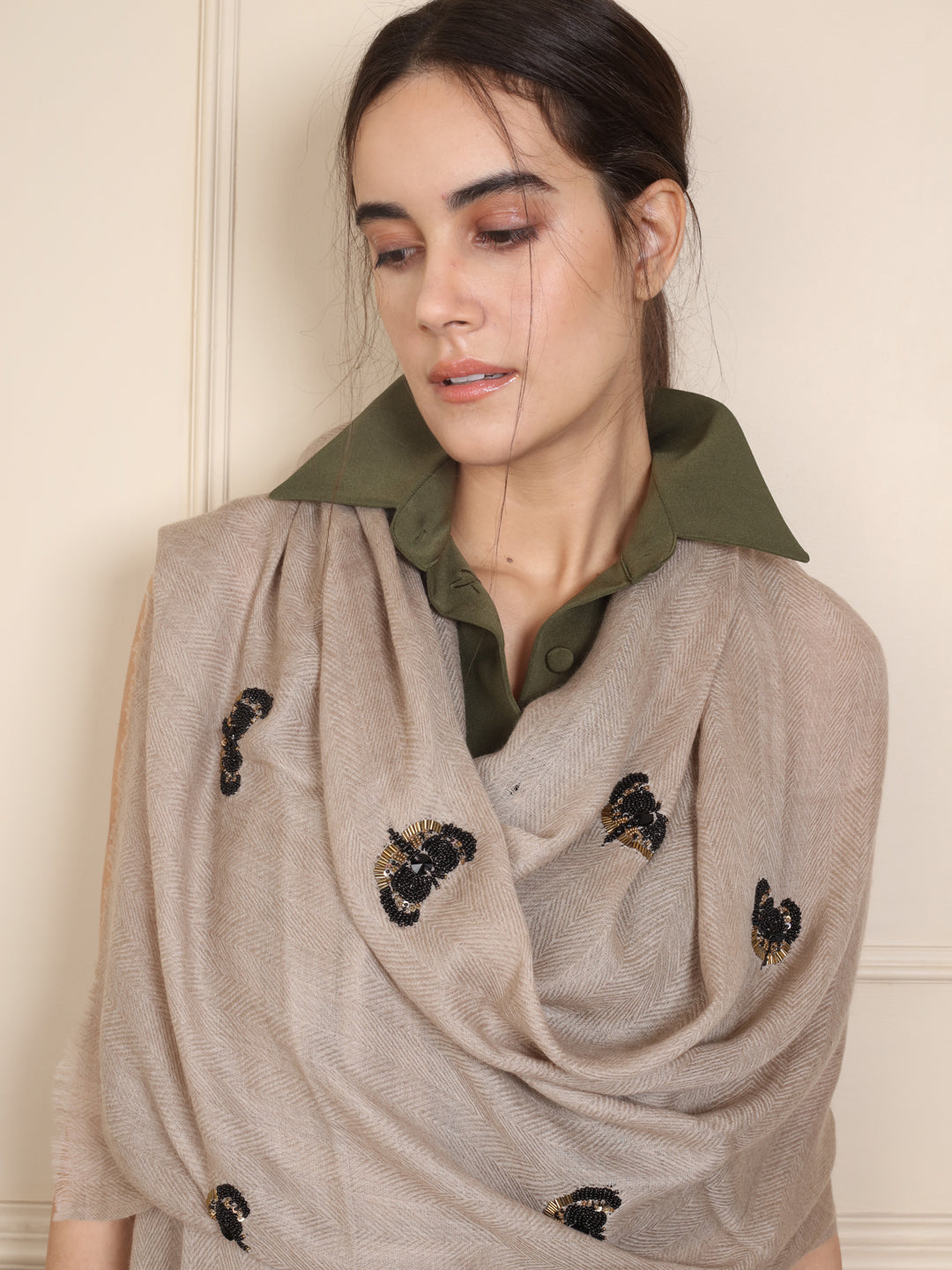 Wrap yourself in luxury with our 100% cashmere stole, adorned with gorgeous embroidered motifs.